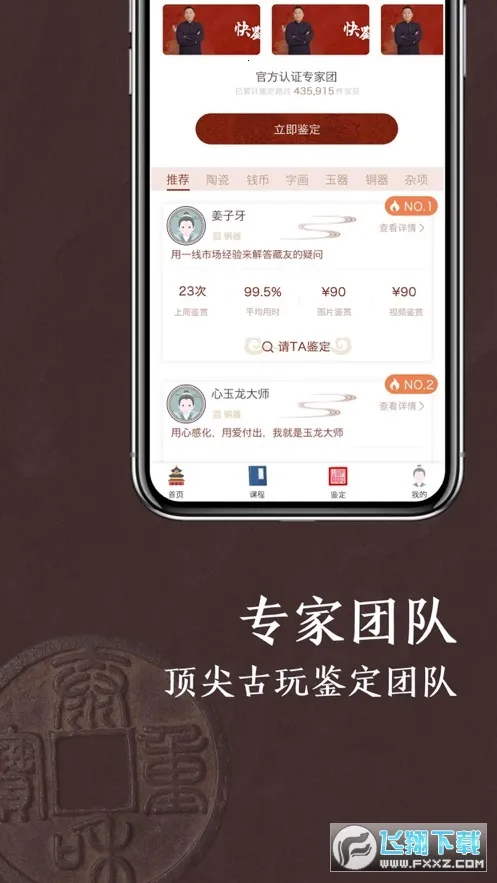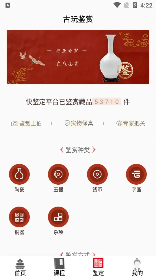 4、涵盖玉器、珠宝等六大古玩品类,知名鉴宝大师等专业人士入驻,提供多种免费鉴宝方式。