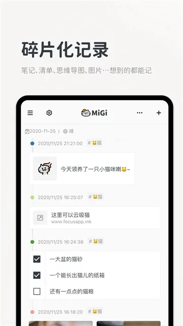 1、Migi笔记本以时间轴为核心,能助力用户轻松管理日常事务、学习笔记与工作计划,通过时间轴管理可按时间顺序清晰呈现生活、学习和工作。