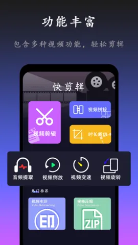 它涵盖了视频裁剪、变速、拼接、音频提取、倒放、旋转等常用功能。比如裁剪功能,能把视频中不需要的部分去掉;变速功能可实现快进或慢放效果。还能为视频添加个性化专属水印,点击音乐按钮能添加背景音乐或音效,增强视频感染力。