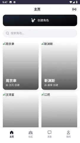 3、创建角色流程简单,进入软件点击上方创建角色,可选择创建新角色或从聊天中创建,输入名称和介绍后点击创建并编辑即可。