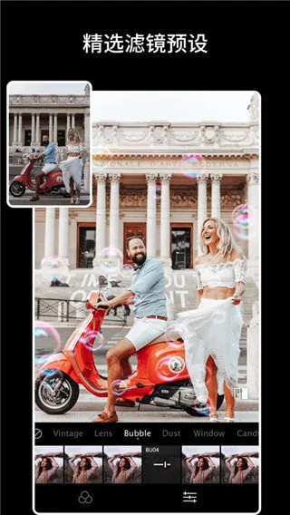 2、滤镜风格多样:提供超1000个高级滤镜,涵盖复古风、港风、胶片、电影等多种风格,还能导入和导出自定义预设,分享创意。