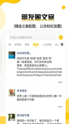 3、精选文案众多,超多精选朋友圈文案可随心预览,方便用户挑选并发布专属内容,打造个性化朋友圈。