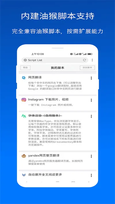 3、可扩展性强:支持安装多种浏览器扩展程序,内置对油猴脚本的支持,兼容主流油猴脚本,能按需扩展浏览器功能。