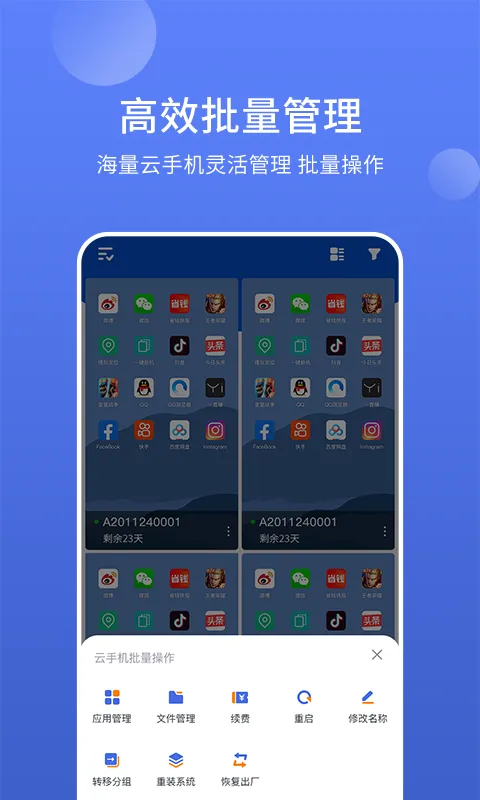 4、多任务处理:支持同时连接多个云手机,可在一个平台上进行多任务处理,极大提高工作和娱乐效率,还支持批量控制多台云手机,实现一键改机。