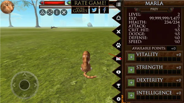 游戏功能丰富,有真实物理引擎,猎物会悬在嘴边;动态天气、季节和昼夜周期,带来独特体验。你通过捕猎小型动物生存,还得小心大型动物攻击。新手进入游戏经验拉满,能肆意奔跑,有无限经验可自由加点,还能后期解锁更换猫咪外观。此外,赚取羽毛可解锁新技能,游戏有原始声音和音乐氛围,真实HD图形,是有史以来最真实的猫咪模拟游戏,玩起来超有意思,快来开启冒险!