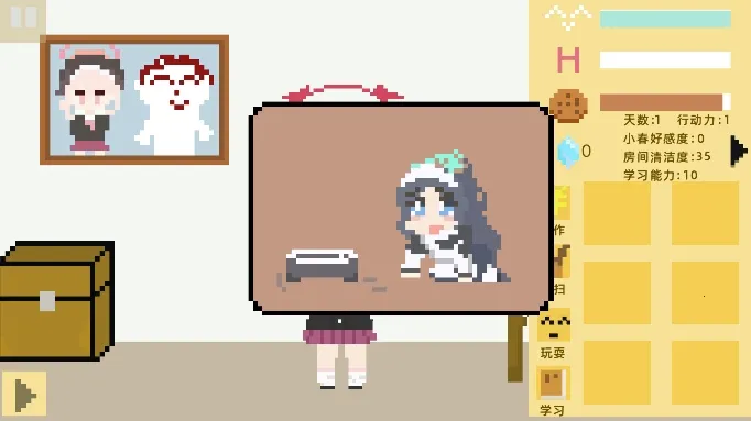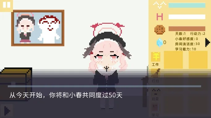 《小春养成记》是一款超有趣的碧蓝档案同人像素风养成游戏。在这游戏里,你能化身为小春的陪伴者,和她共度50天校园生活。每天可为小春规划两次行动,比如首次外出工作稳获100石头,第二次收益不定。保持房间整洁很重要,脏乱会降她心情值,陪她玩耍能快速恢复心情。定期辅导功课可提升学业能力,应对三场关键考试。游戏特色满满,以对话推动剧情,多场景自由探索,玩家选择影响力大,有七种结局。还能换装、经营,与NPC互动解锁隐藏对话。随机事件丰富,像好赌小厮、膳房失火等,不同选择有不同影响。玩法多样,能满足你各种需求,快来开启这段独特的养成之旅,为小春编织专属校园回忆吧!