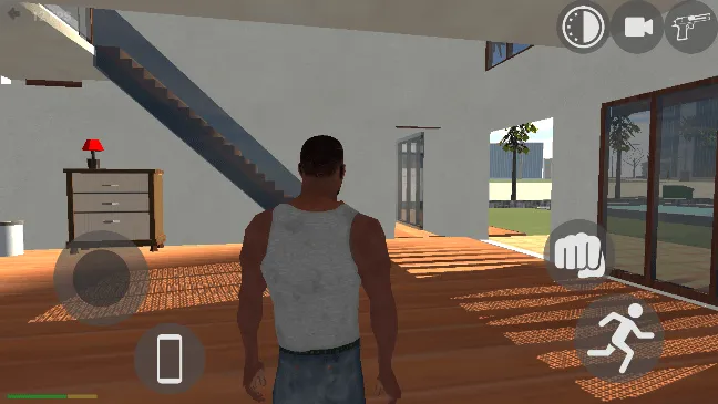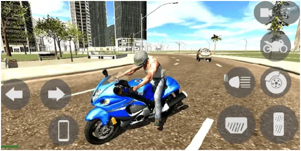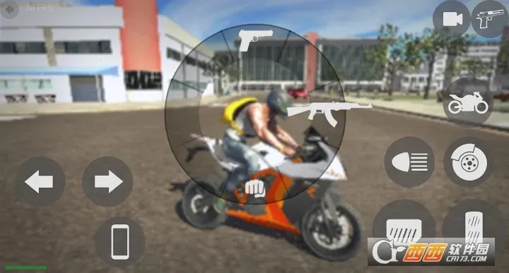 2、通过控制摇杆让人物走到房子外骑上摩托车,点击左右两侧的功能按钮控制车辆。