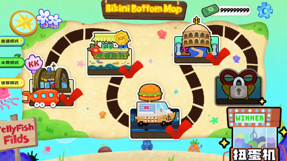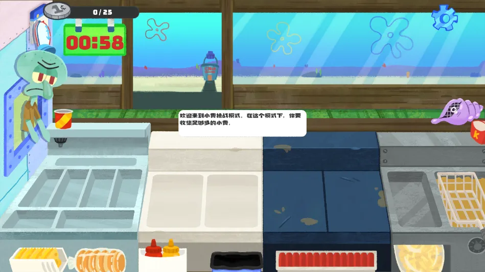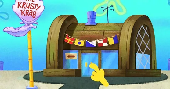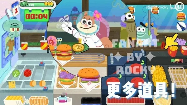 2. 游戏以海绵宝宝动画中的蟹堡王餐厅为背景,画风可爱有趣,人物角色是卡通形象,带来沉浸式体验。
