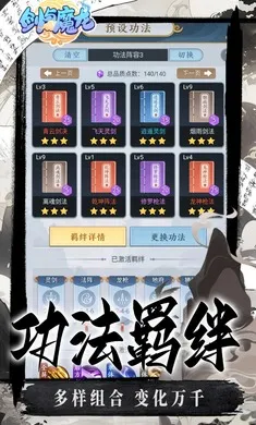 2. 有64种功法、10种职业、14种宗门,可自由搭配组合不同羁绊效果。