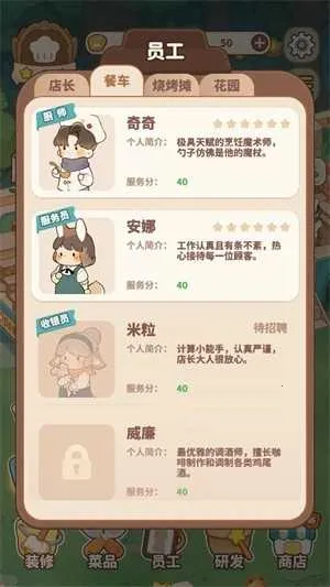 5、点击员工可以消耗金币来招募不同的员工,或者是对员工进行培训。
