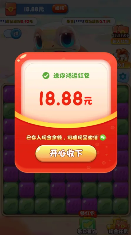 4. 福利满满,完成消除任务有红包拿,观看广告能领红包币,累计指定数额红包币可提现秒到微信。