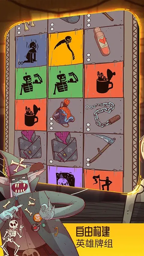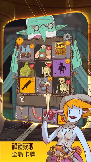 游戏里,你将操控英雄带着基础牌组进入地下城,牌组被洗入后随机抽九张卡牌排列成网格,有物品、技能和怪物。击败怪物得金币换物品技能,消掉卡牌会有新卡补充。点击怪物卡牌触发战斗,点击装备卡牌可收集或丢弃换金币回血。
