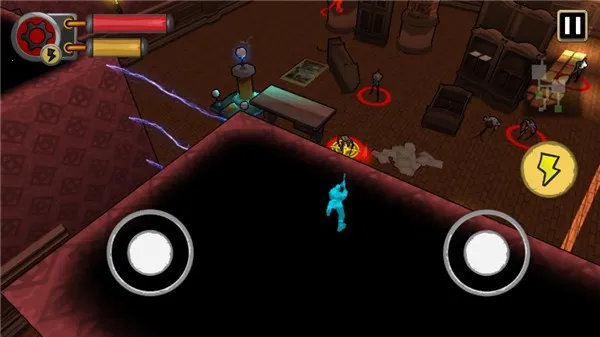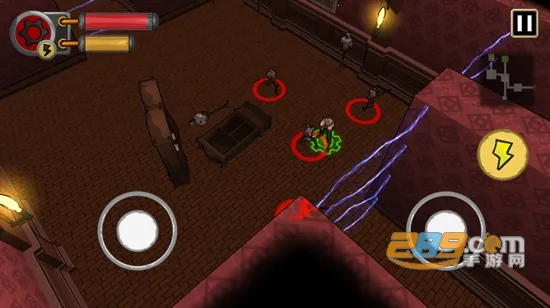 4、操作方面,双摇杆机制分别控制移动与攻击方向,左边轮盘管方向,右边轮盘管攻击,点击闪电可释放技能,战斗时能先找技能点增强实力。