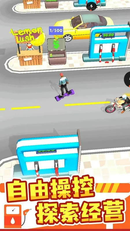 1、可自由操控,探索加油站每个角落,踏上飞行器收集资金。