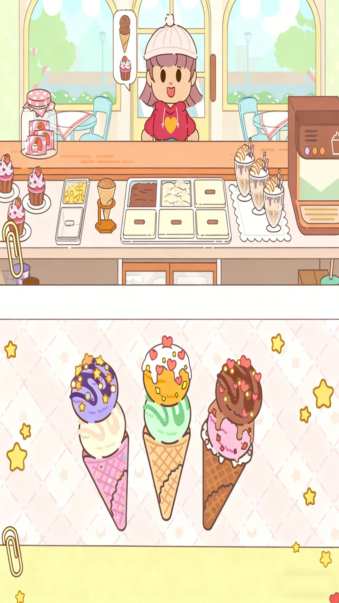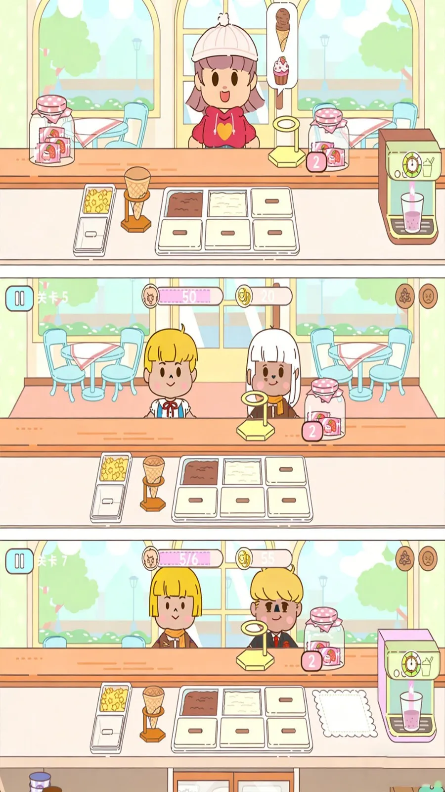 1. 从基础小店起步,逐步解锁扩大经营空间,自由规划功能区域布局,打造专属冰淇淋店。