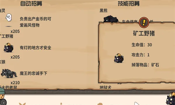 1. 操作简便,主要集中在手动点击魔王技能,不操作会被冒险者攻破迷宫,轻松上手。
