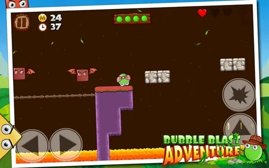 《爆破泡泡历险记》是一款超好玩的平台跳跃游戏。操作简单,只需四个按钮就能控制角色左右移动、跳跃与射击。画面简洁明亮,关卡超丰富,能让你充分利用闲暇时光。在游戏里,你要操控泡泡寻找钥匙打开大门,探索隐藏的宝藏。独特的艺术风格虽不惊艳但很精彩,还有丰厚成就奖励等你领取。游戏中,绿豆豆是进攻必备,子弹槽有4颗绿色子弹,点击爆破键可发射。触碰到敌人时,先消耗子弹,子弹掉落后可再收集但数量减一;子弹槽没子弹则消耗爱心,三颗爱心用完游戏结束。游玩时要注意躲避障碍、陷阱,留意血量和时间限制。躲避障碍吃到金币、绿豆和爱心是重点,还有重重机关等你开启。它既有智力挑战,又有精彩剧情,能给你全方位新鲜感受,快来下载体验这场冒险吧!