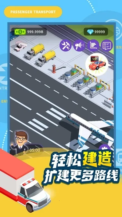 玩法上,能修筑交通设施,增设营业建筑提升收益。通过广告宣传吸引乘客,查看运营报告辅助决策。新手玩法也简单,先造设施、搞宣传,有了钱升级大巴,乘客多了就升级停车位、新建售票机和安检机。