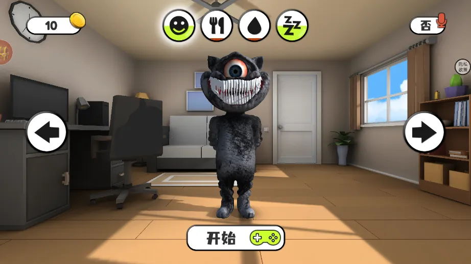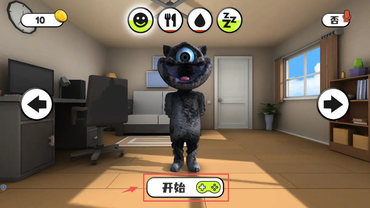 1、首先打开软件会看到一只怪猫,留意它上方的笑脸、水滴等状态图标,别忘了左上角有金币数量,点击怪猫面前的“开始”按钮就正式进入。