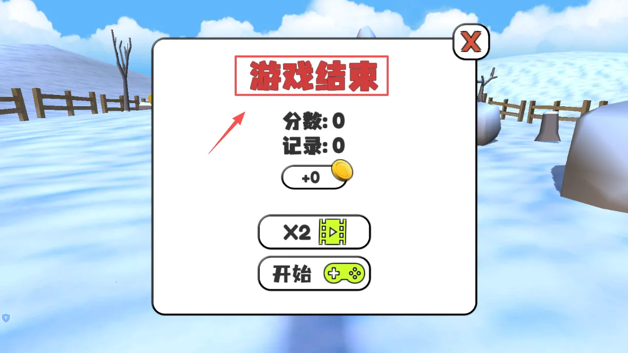4、游戏结束后会出现结算界面,你的分数和破纪录情况都会显示,可以用金币奖励尝试翻倍,或者直接点击开始按钮重新再来一局。