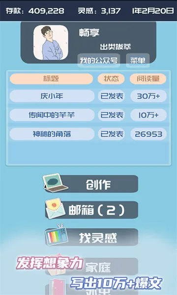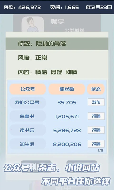 1. 以自媒体为题材,玩家扮演自媒体人经营公众号,体验从新人到新星的全过程,感受真实的自媒体生活。