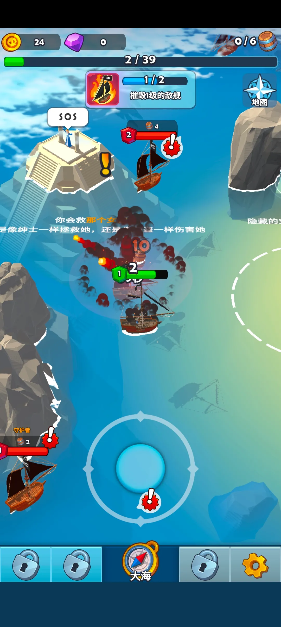 2. 操作轻松易上手,拖动虚拟摇杆就能控制海盗船移动,发射炮弹攻击敌人毫无压力。