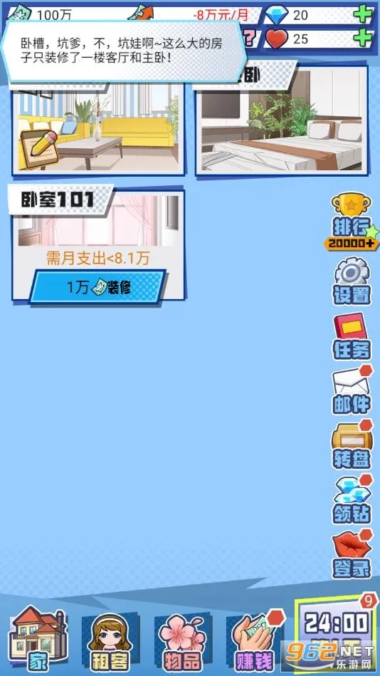 1. 可解锁装修房屋,达特定条件能装修不同风格房间,邀请更多美女租客入住。