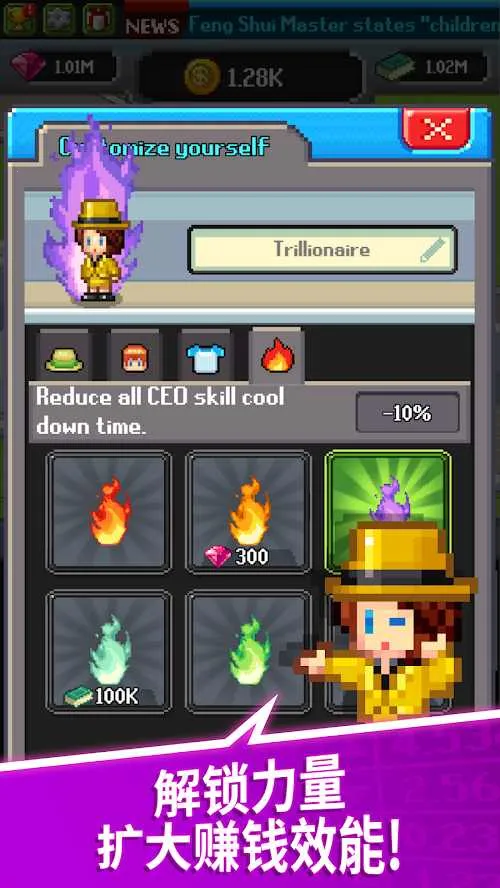 点点亿万富翁是一款像素风模拟经营放置手游。玩家扮演公司老板,通过点击、雇佣员工、股票交易等赚钱,还能升级办公室、招募人才,体验从白手起家到成为亿万富翁的全过程。