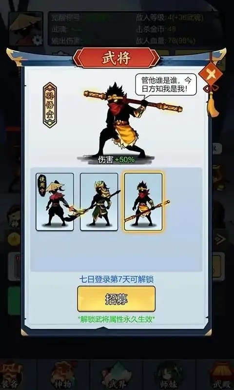2. 游戏中通过击杀敌人可获得金币和武魂,用来购买装备升级、武魂觉醒等,不断提升在武林的地位,解锁各类神器和神物,玩法极具策略性。