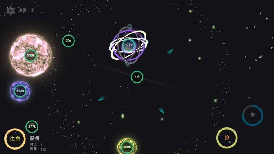 4. 游戏玩法中质量概念贯穿始终,大质量星球可摧毁小质量星球,玩家要遵循生存法规,不断吸收小行星质量来发展行星。