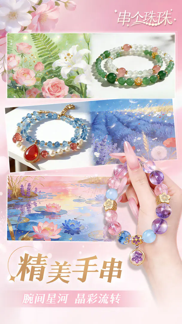 串个珠珠最新手机版中,玩家化身手串摊主,依顾客订单用珠子定制手串,通过小游戏解锁材料,升级摊位,还能社交互动、作品PK,集经营创意休闲于一体,体验制作与经营乐趣。