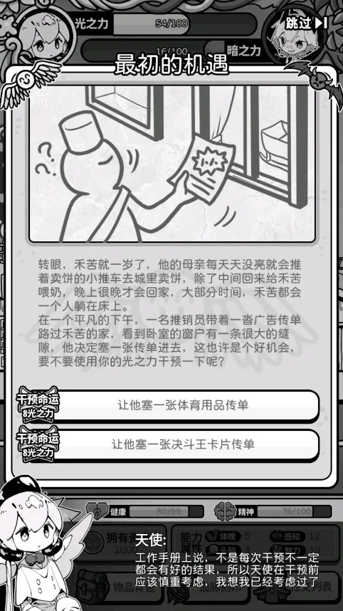 天使模拟器免广告是一款黑白动漫画风的策略养成游戏。玩家扮演天界救赎部天使,为倒霉短命鬼提供庇护,通过卡牌组合、资源分配干预其人生轨迹,面临诸多选择与意外,有多种职业与玩法。