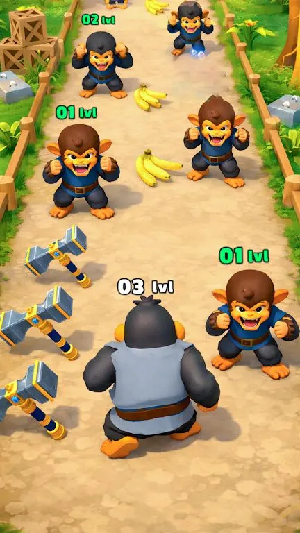 猿猴跑酷游戏中,玩家从一只小猿猴开始,左右滑动避开障碍物,吃掉等级低的猿猴成长,拾取锤子破障,避开更强猿猴,冲过终点进化成强大猩猩,有无尽跑酷玩法等特色。