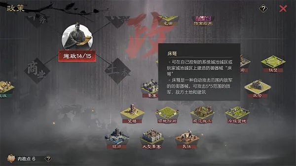 属于防御类器械,放于主城,可自动攻击范围内的敌军,但使用条件有些苛刻,要全弓部队。调整以后不再消耗体力,攻击部队,也能打敌方建筑耐久,看起来挺有意思的。