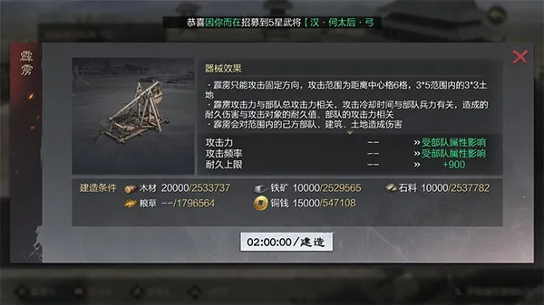 建造消耗:生产和使用都不占用建设值;需耗时5小时,无法加速;一支吕公车需要四种资源各两万。
