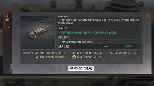 跨河打击必备!一般用于特殊战场,两军河口对垒。可以对桥对面发动类似国家策略强袭,无法占领,但可消耗耐久。调整后,布置时间为12小时,飞桥布置者可借助布置好的飞桥跨河出征并占领飞桥连接的土地,大大增加了战场战术准备,也多了很多新的可能。但是布置期间视野全开,这就要注意使用时机。改版后的飞桥相当于人造码头。