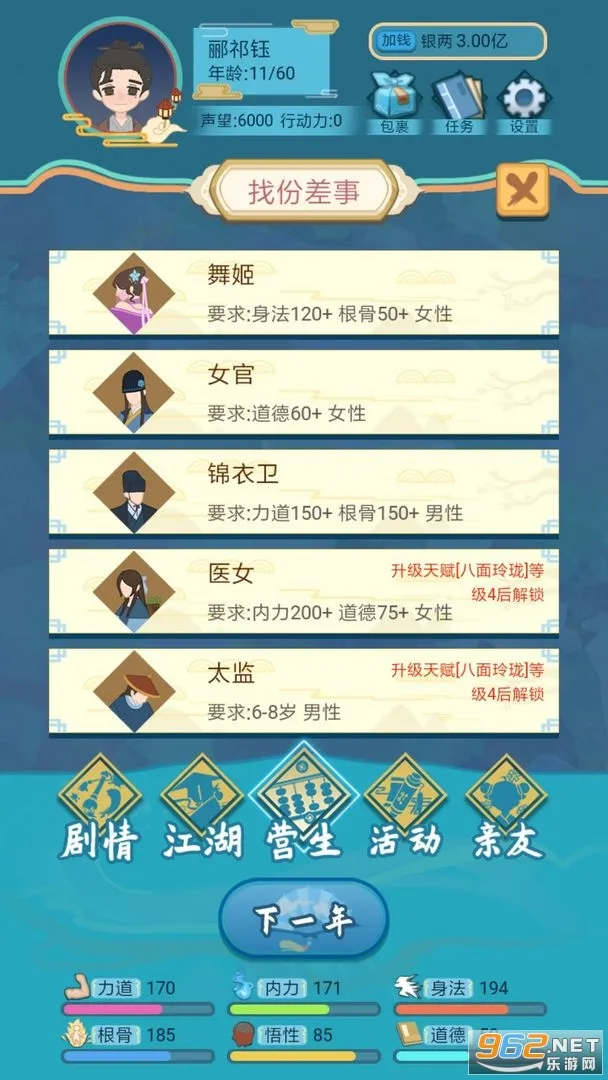 3. 随机天赋开局,每局都是全新人生,带来不一样的江湖体验。