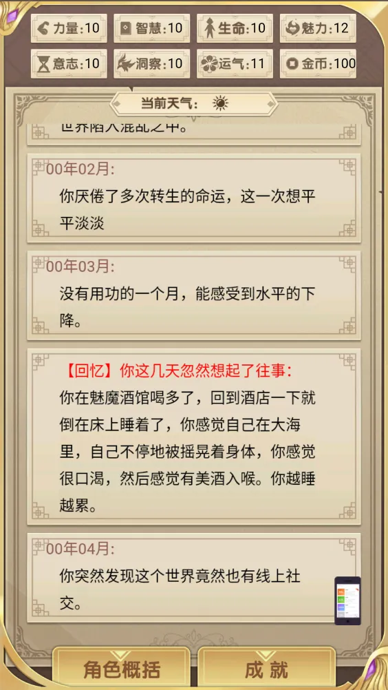 2、丰富剧情与成就系统,玩家通过每次冒险解锁不同成就,借此增强自身属性,在轮回转生中不断成长。