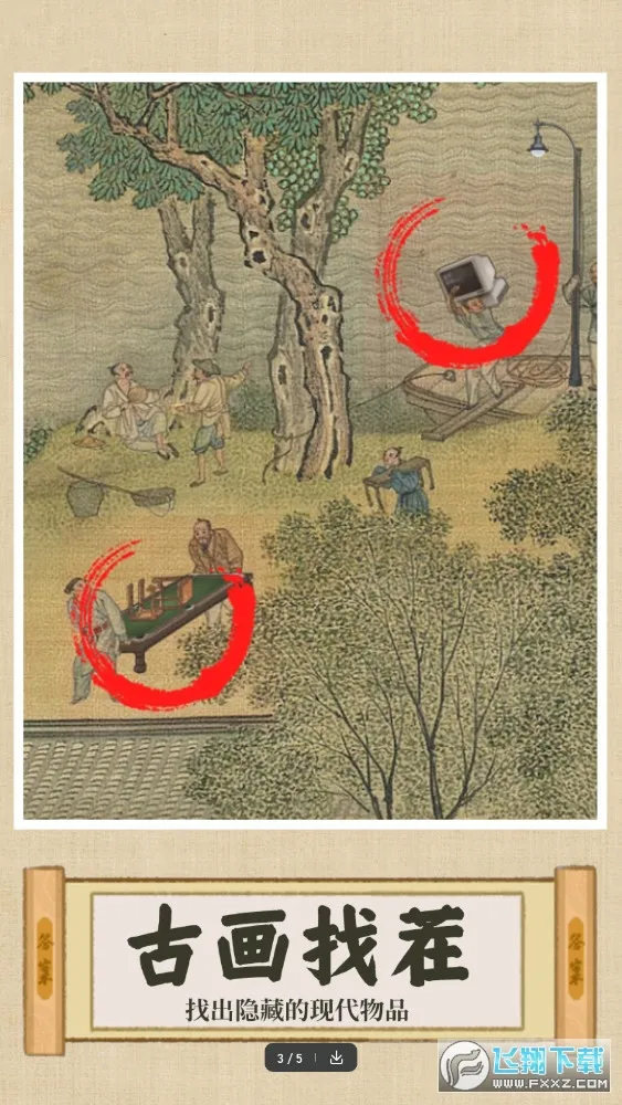 这是一款古画找茬休闲益智手游,玩家需在古画中找不合时代特征的现代物品。关卡丰富,考验眼力与逆向思维,画面清新,操作简单,能带来趣味解谜体验 。