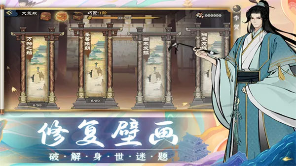 3、修复壁画,破解身世迷题:剧情以画师视角展开,在修复大荒殿壁画过程中,遇到奇人异事,结识好友,解锁新区域,融合多种元素。