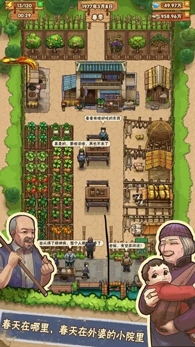 3、美术风格怀旧,手绘画风细腻,色彩搭配鲜艳,季节主题设计用心,不同季节景色活动各异,增加真实感。
