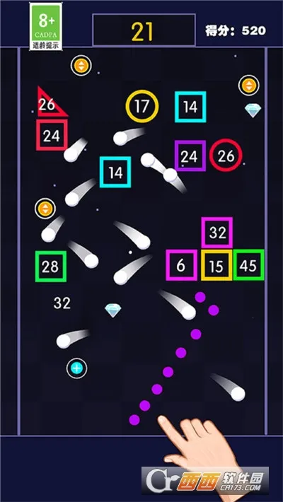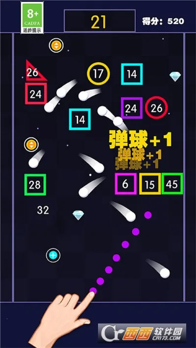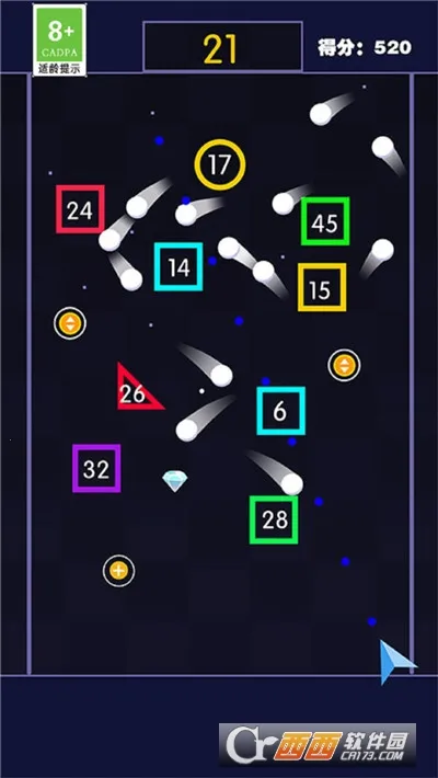 1、玩法解压:玩家控制弹珠击碎方块,打入洞口有额外奖励,过程轻松解压。