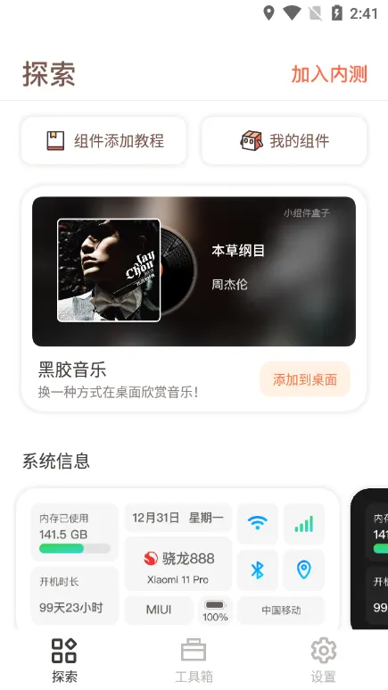2、信息丰富:软件有许多信息类小组件,能为用户提供各行各业有用的信息,还可在桌面上查看手机的各种状态,如内存、电量、系统版本等,同时每日诗词小组件能让用户感受五千年文学精粹。