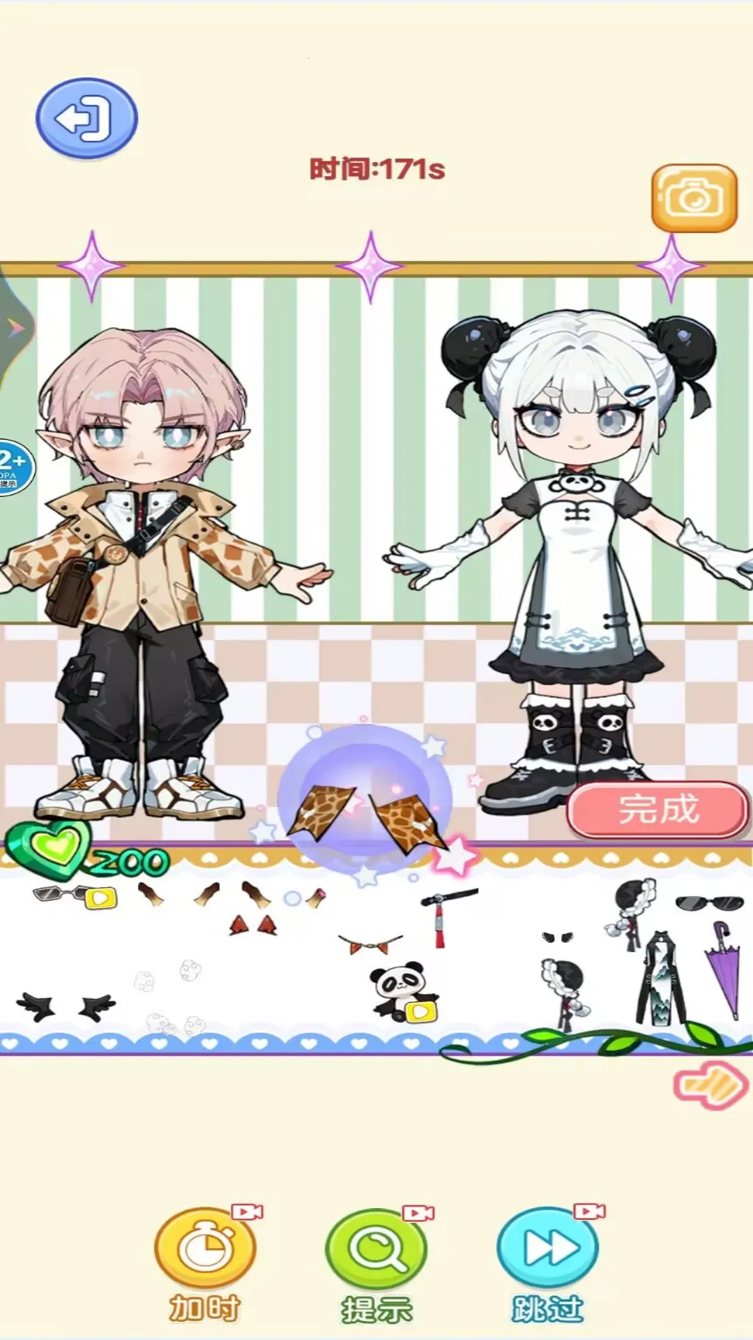 1、服装类型丰富,可自由试穿所有服装,设计可爱角色,还能与角色互动、参与益智小游戏获金币解锁新服装。