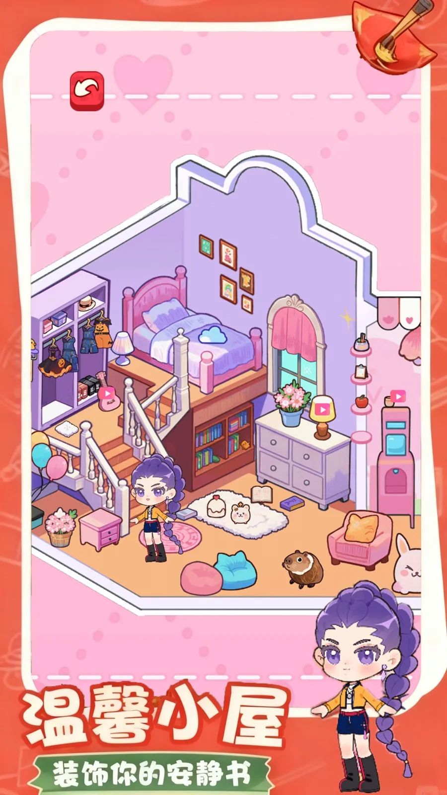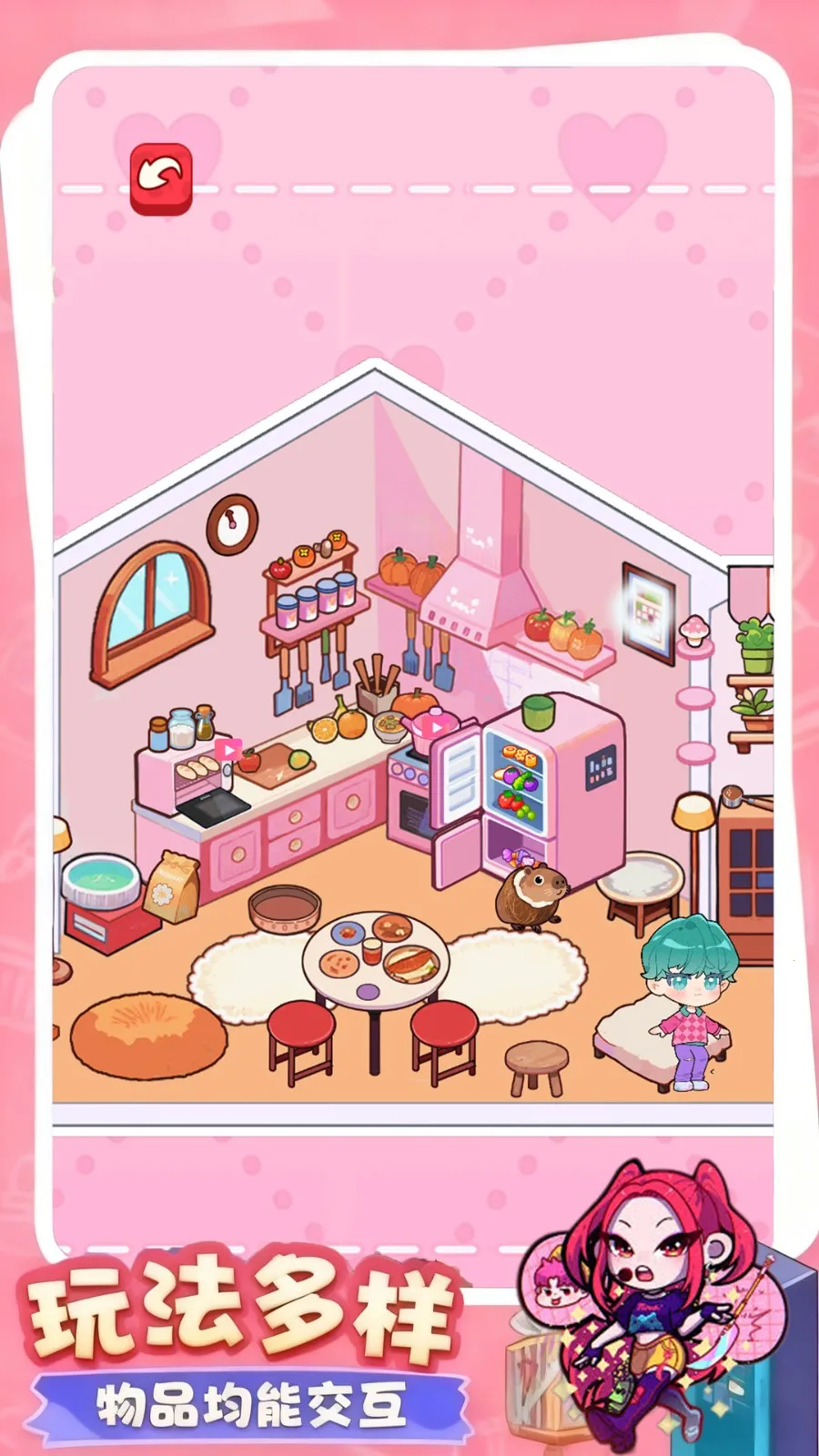 1、能与不同造型角色互动,搭建小屋、设计服装,带领完成跳舞挑战解锁高人气舞台,还有多样换装玩法。