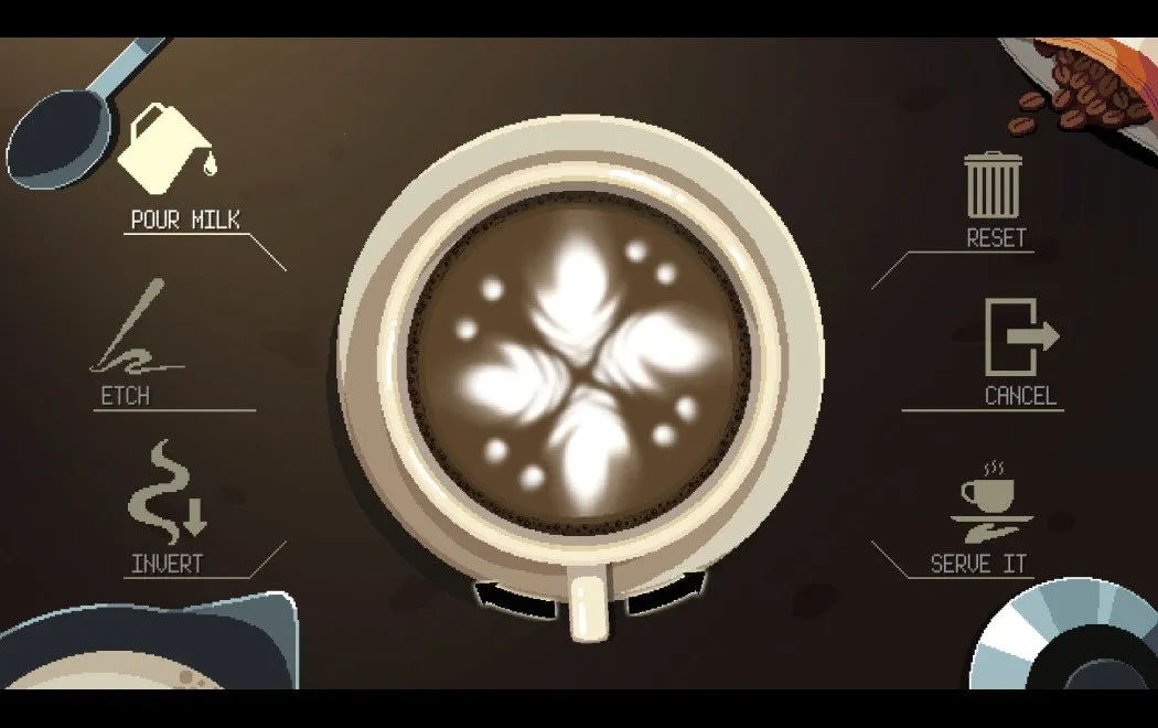 游戏情节发展不靠对话选项,而是看你调的饮品。它设定在奇幻现代社会,精灵、兽人、人鱼和人类共处。游戏采用90年代日本动画风格像素美术,冷色调画面搭配精选爵士乐与低保真音乐,营造出深夜咖啡馆的治愈氛围。