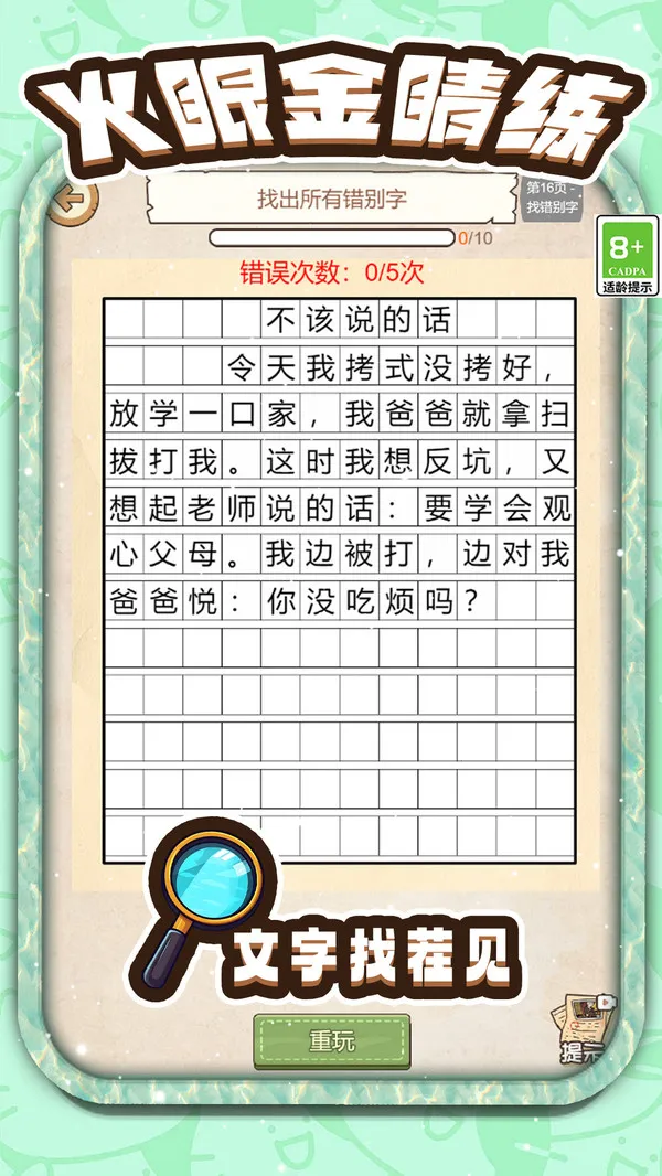 3、难度合理:难度梯度设置合理,从入门到高阶逐步提升。玩家可先从简单关卡入手,如首局找茬选低难度文本,熟悉操作逻辑与积累经验,之后再挑战高阶关卡。