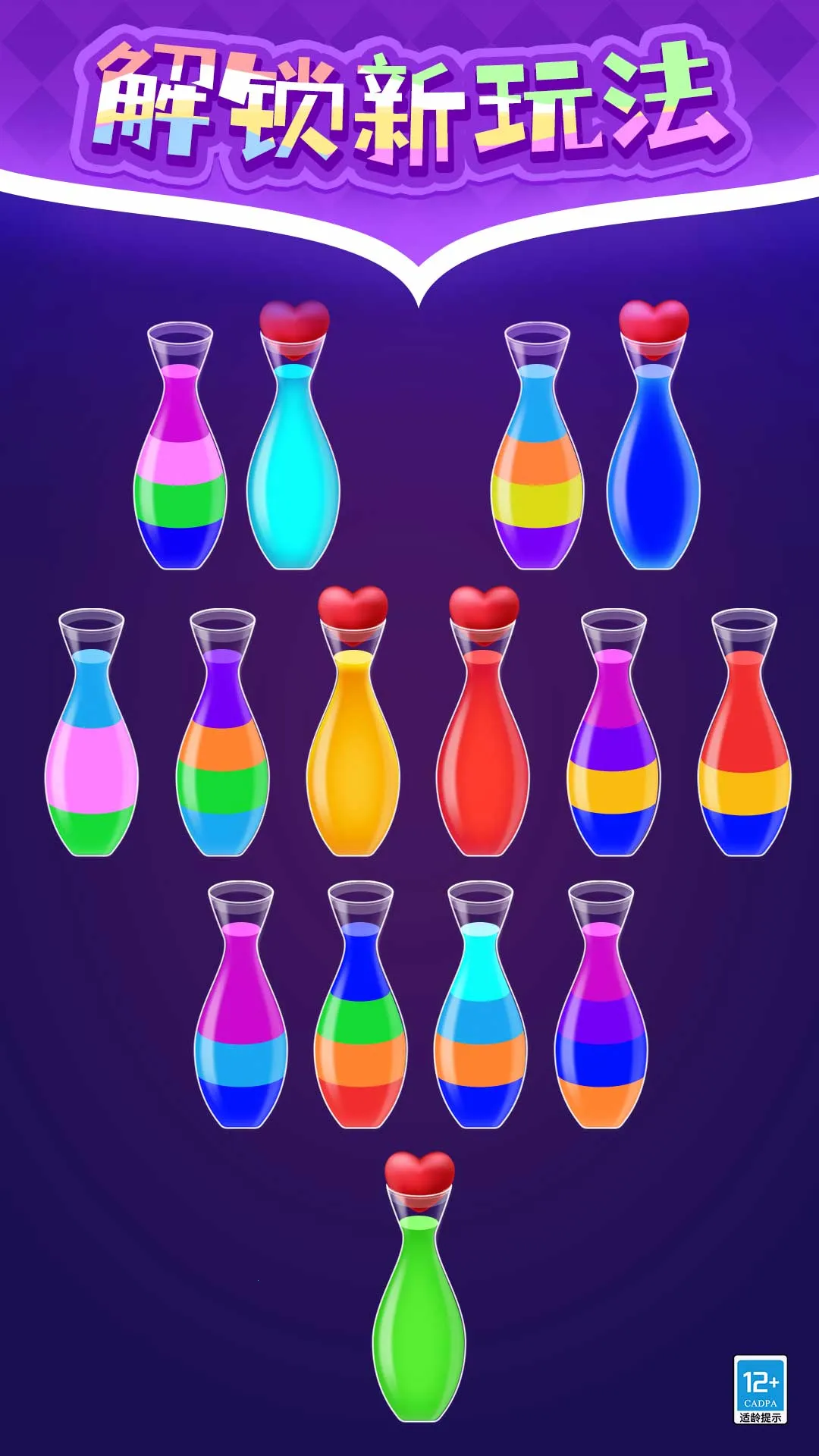 1、解谜玩法独特,需将混杂在不同容器里的各色水流重新归类,从简单双色分离到复杂多层混合,每个关卡如同完成一件流动艺术品,过程特别舒心。