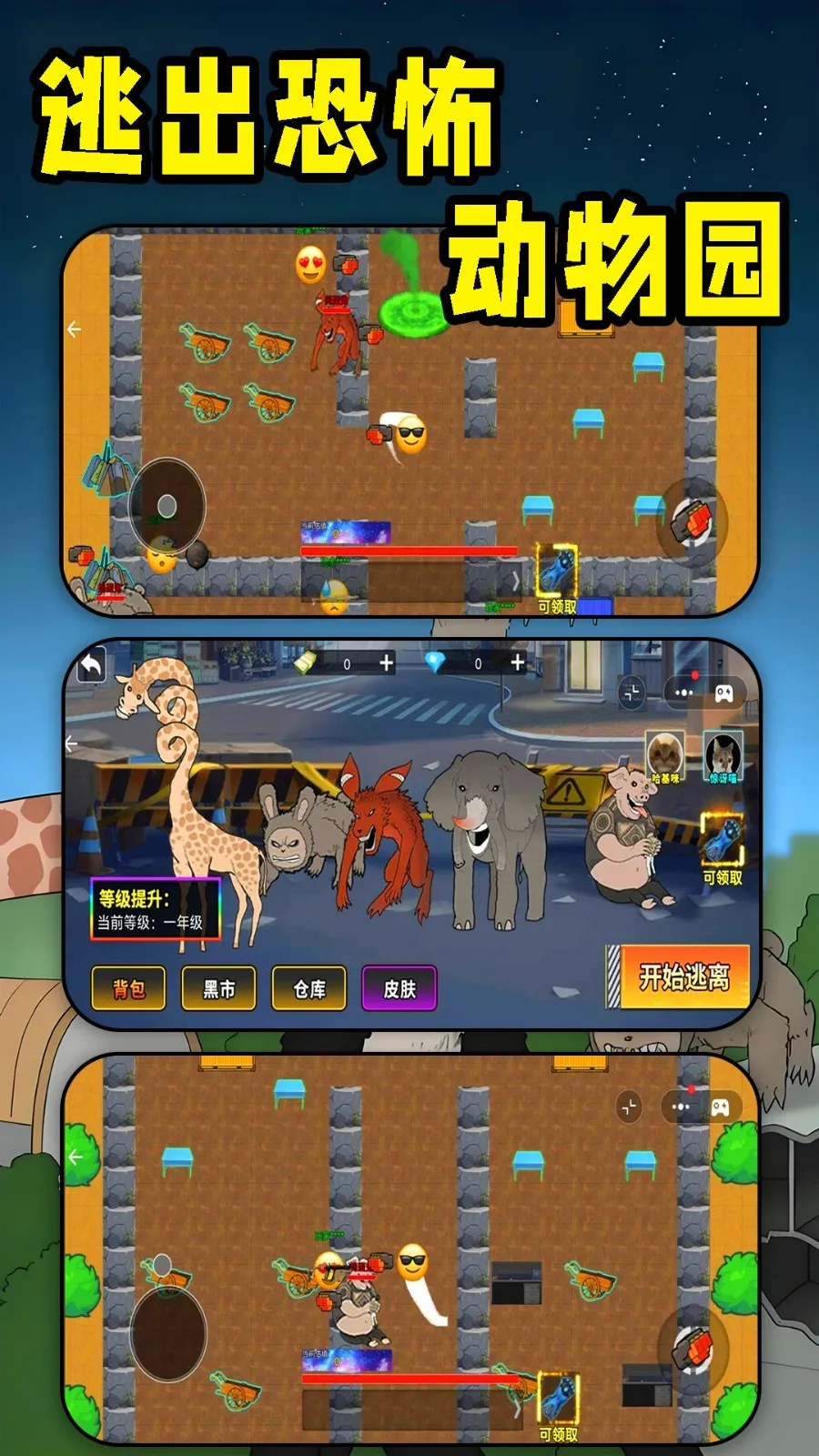 1、《动物园惊魂(动物园逃生)》玩法独特,玩家扮演被困动物在危机四伏的动物园中求生,要从多种动物NPC和巡逻保安的看守下逃亡,通过虚拟摇杆控制移动,搜寻变异标本兑换积分,还能更换服装,新手可先选简单区域。