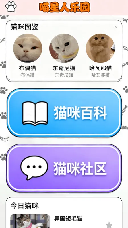 2、内容丰富多样:在喵星人乐园能了解猫咪图鉴、百科、社区等内容;猫咪社区有精彩视频和互动乐趣;猫咪管家可进行喂食记录、健康追踪等;猫咪互动页面有寻找猫咪游戏等操作。